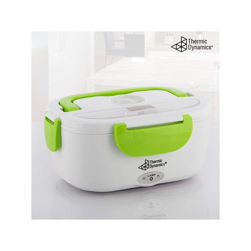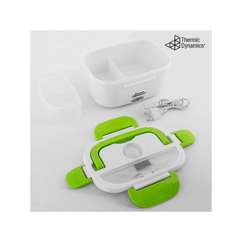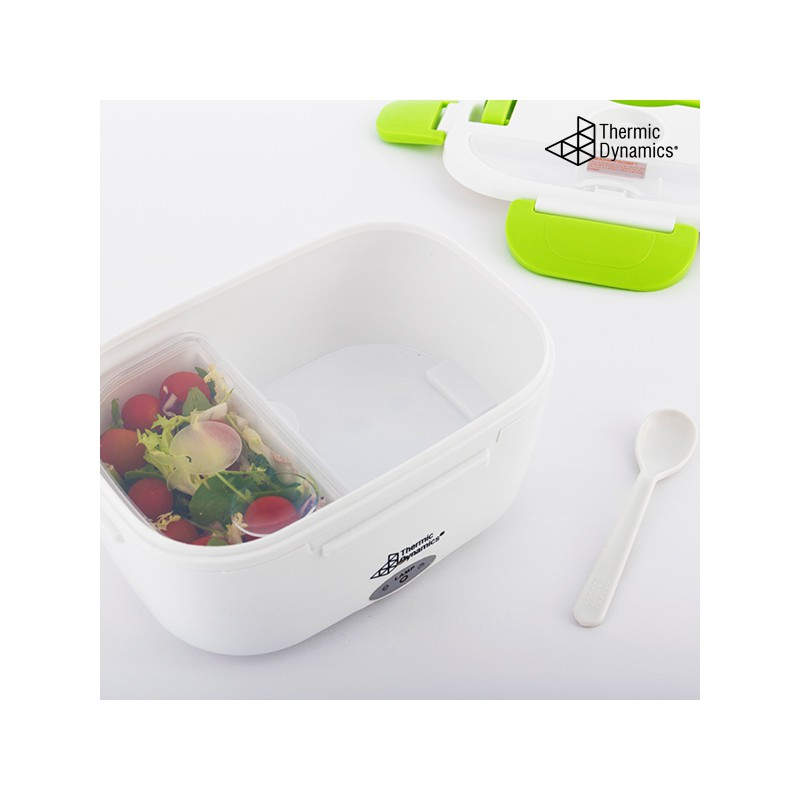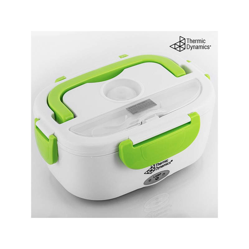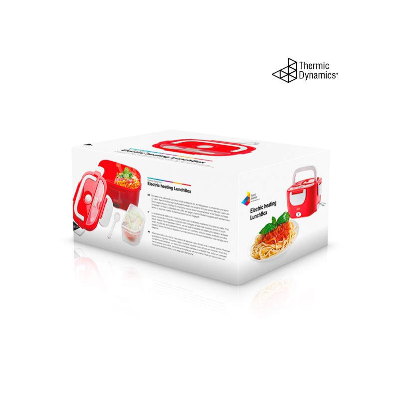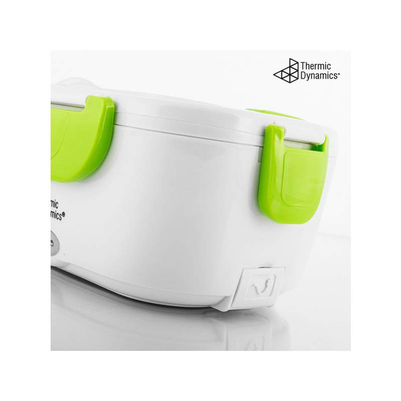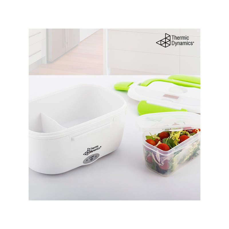 La fiambrera eléctrica Thermic Dynamics tiene un diseño moderno y funcional. Es ligera, manejable, fácil de limpiar y transportar gracias a su cómoda asa. La tapa cuenta con cuatro dispositivos de cierre, válvula de expulsión de vapor y un compartimento para cubiertos (incluye cuchara de plástico). Esta fiambrera multifunción dispone de dos compartimentos internos independientes, uno de los cuales es extraíble. Puede utilizarse como fiambrera convencional para alimentos fríos o frescos, para calentar la comida, o para mantenerla a buena temperatura. Su avanzado sistema de calor infrarrojo proporciona un calentamiento rápido y el consiguiente ahorro de energía.