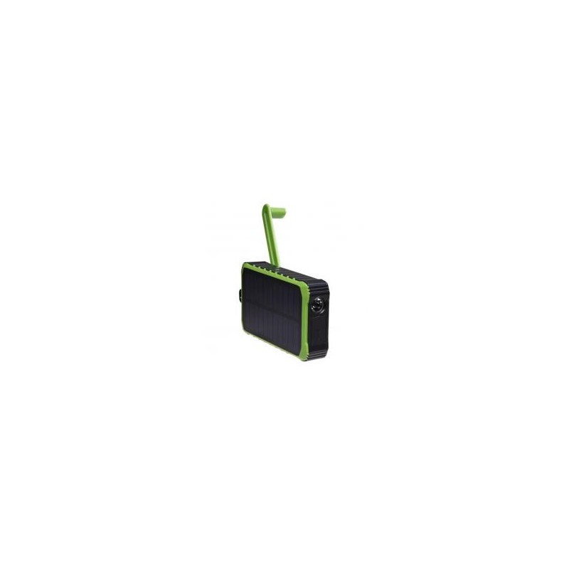 informaci?n del producto powerbank solar con pol?mero de litio de 10.000 mah se carga a trav?s de usb - c + c?lulas solares en la parte superior dispone de dinamo de manivela para potencia adici?nal. entrada: 5v 2a salida: 2x usb - a 5v 2a (m?x. 2 -1a) con indicadores led de capacidad linterna incorporada ip65 a prueba de salpicaduras de