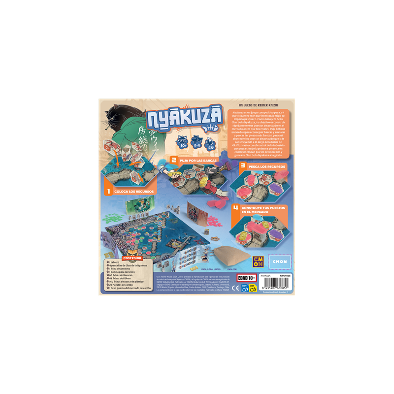 Nyakuza es un juego de mesa competitivo dise?ado por el reconocido autor Reiner Knizia. Pensado para 2 a 4 jugadores y con una duraci?n aproximada de 40 minutos, este t?tulo te pone en la piel de un gato jefe de Clan, compitiendo por el control del comercio pesquero en la bah?a de Oki-Yo. Una propuesta ideal para amantes de los juegos de estrategia con mec?nicas de subastas, colocaci?n de recursos y control de ?rea.