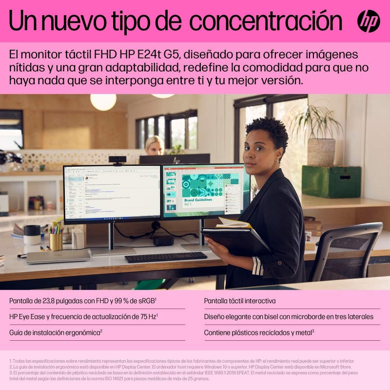 Materiales y tecnologías sostenibles --> Nivel bajo de halógeno; La caja interior de relleno de pulpa de papel moldeada es 100 % de origen sostenible y reciclable; Tanto la caja exterior como el material de relleno corrugado son 100 % de origen sostenible y reciclable; Contiene plástico reciclado destinado a terminar en los océanos; 80 % de plástico de circuito cerrado ITE derivado; Al menos un 25 % de metal reciclado