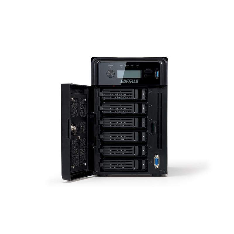Buffalo TeraStation 5600 18TB. Capacidad total de almacenamiento instalada: 18000 GB, Tipo de unidades de almacenamiento instaladas: Unidad de disco duro, Tipos de unidades de almacenamiento admitidas: Unidad de disco duro. Familia de procesador: Intel Atom, Modelo del procesador: D2700, Frecuencia del procesador: 2,13 GHz. RAM interna: 2 GB, Tipo de memoria RAM interna: DDR3. Ethernet LAN, velocidad de transferencia de datos: 10,100,1000 Mbit/s, Protocolos de red compatibles: TCP/IP, Tasa de transferencia (máx): 1000 Mbit/s. Color del producto: Negro, Tipo de visualizador: LCD