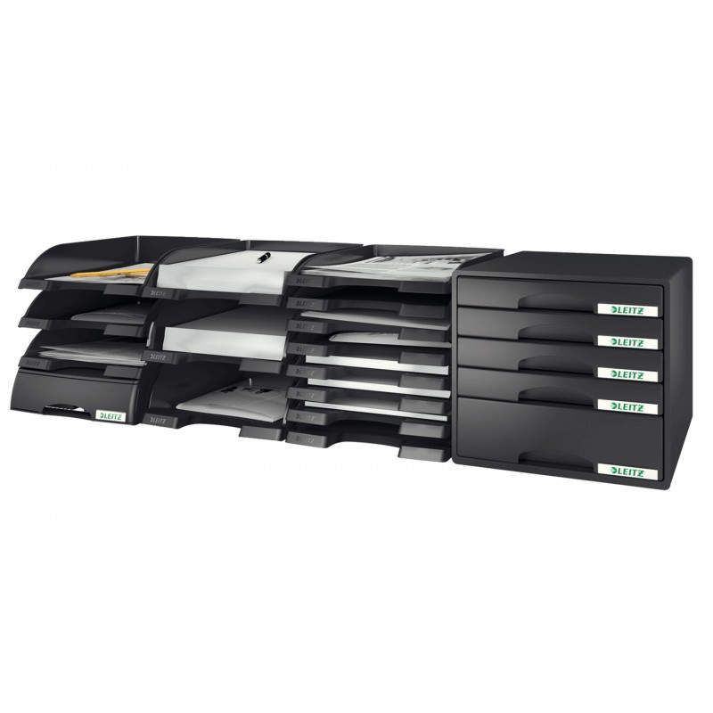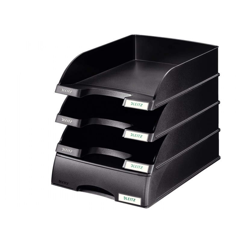 Características Material --> Poliestireno (PS) Color del producto --> Negro Formato --> A4 Apilable --> Sí Elevador(es) --> Sí Divisor --> No Número de bandejas de apilado (máx.) --> 10