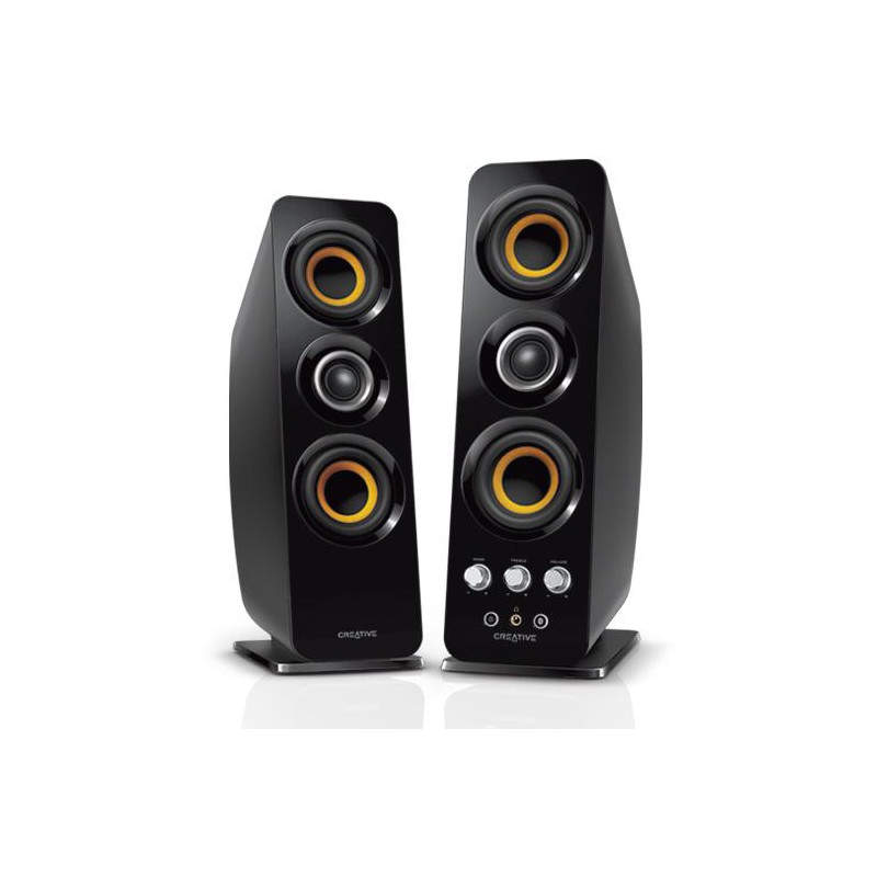 Con un aspecto elegante gracias al acabado de piano en negro brillante, el contraste del borde amarillo de los conductores y los detalles de color plateado, los Creative T50 Wireless llaman la atención y son perfectos para complementar cualquier sala o habitación.