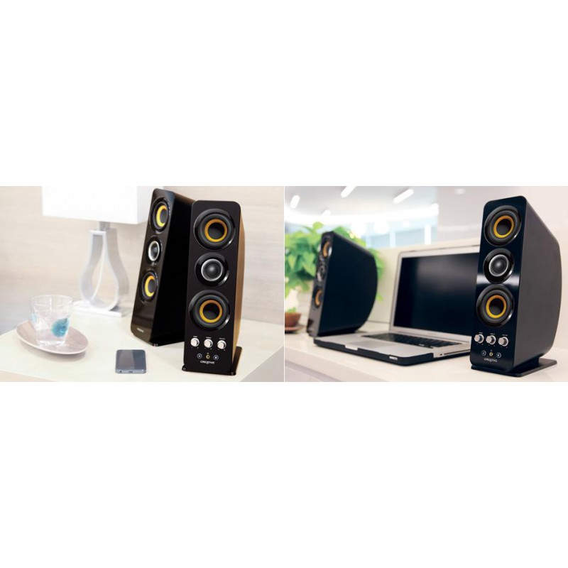 Los altavoces también se han diseñado pensando en la comodidad: los controles, como el botón para encenderlos y apagarlos, y los ajustes de volumen, graves y agudos están situados en el panel frontal para que se pueda acceder a ellos fácilmente.
