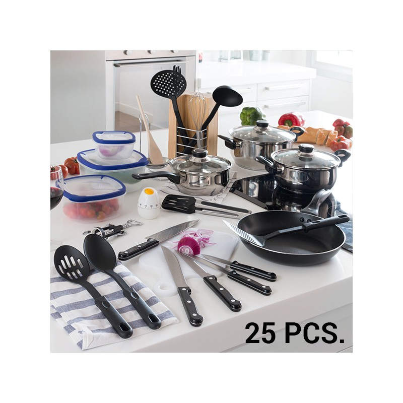 ¡No busques más y consigue ya el completo y práctico set de accesorios de cocina (25 piezas)! Apto para cocinas de gas, eléctricas y vitrocerámicas (no apto para inducción).