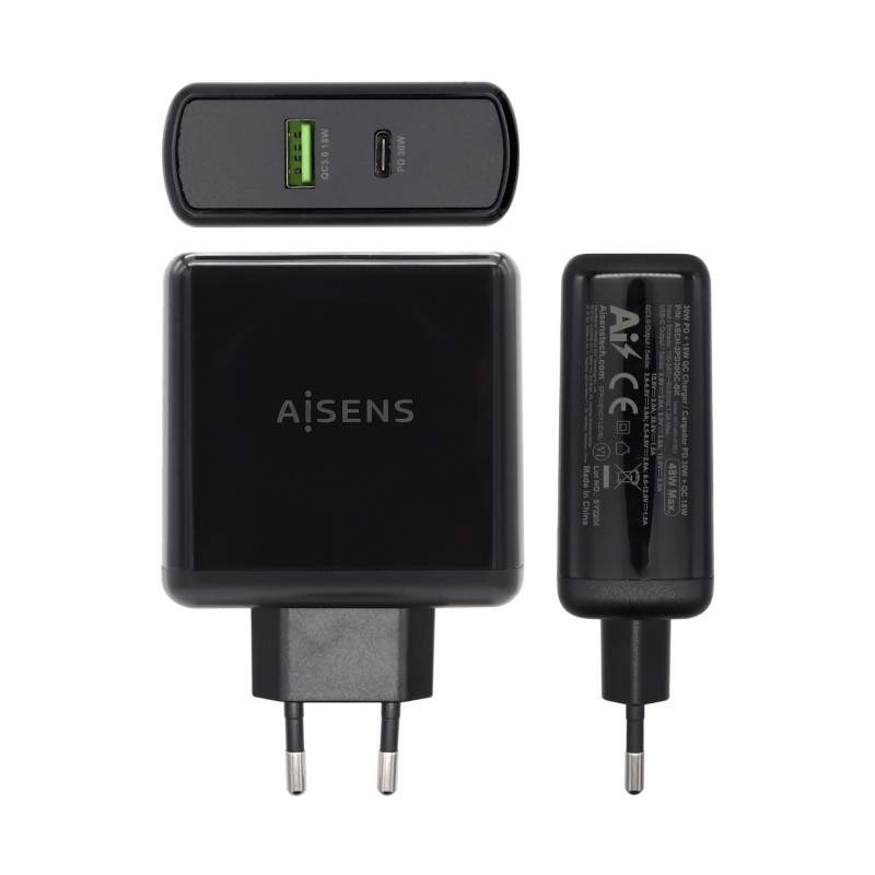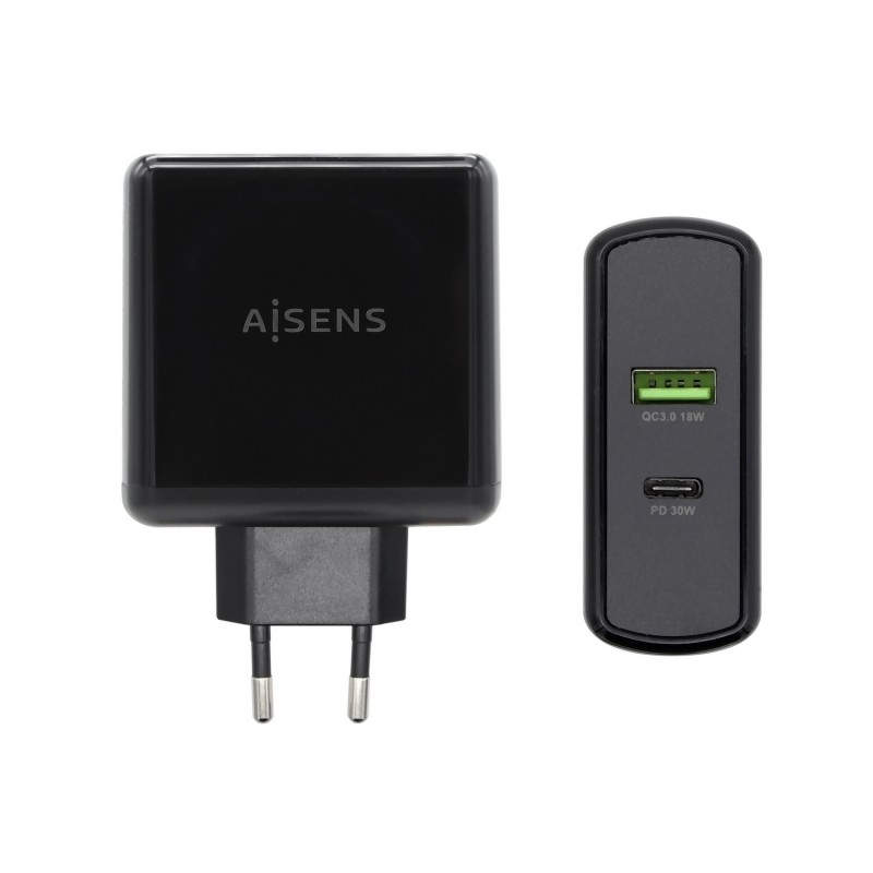 AISENS Cargador 48 W, 1x USB-C PD3.0 30 W, 1x USB-A QC3.0 18 W, Negro - ASCH-2PD30QC-BK