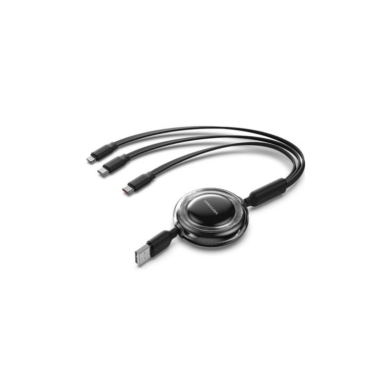 Cable USB Retráctil Vention TRJBBE/ USB Macho - Lightning/ 2xUSB Tipo-C/ Hasta 17.5W/ 10Gbps/ 1.1m/ Negro