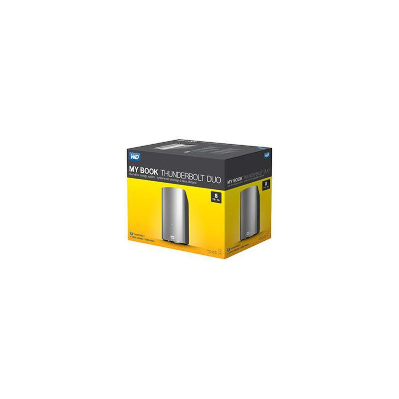 Western Digital My Book Thunderbolt Duo 8TB. Capacidad de disco duro: 8000 GB, Velocidad de rotación de disco duro: 5200 RPM, Interfaz del disco duro: Thunderbolt. Tecnología de conectividad: Alámbrico, Velocidad de transferencia de datos: 10000 Mbit/s, Niveles RAID: 0, 1, JBOD. Voltaje de entrada: 100-240V, Frecuencia de entrada: 47 - 63 Hz. Color del producto: Negro, Plata. Ancho: 9,9 cm, Profundidad: 15,7 cm, Altura: 16,5 cm