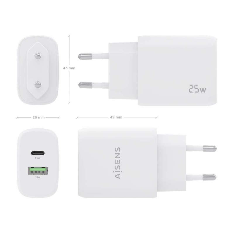 AISENS Cargador 25W, 1xUSB-C PD3.0, 1xUSB-A QC3.0, Blanco