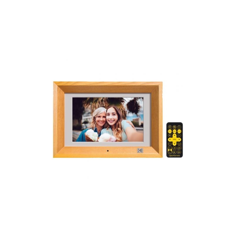 Marco digital KODAK RDPF1020BU en madera natural, pantalla de 10 y resolución HD 1024×600 píxeles, relación de aspecto 16:9, compatibilidad USB y tarjeta SD, funciones como calendario, reloj y presentación de diapositivas.