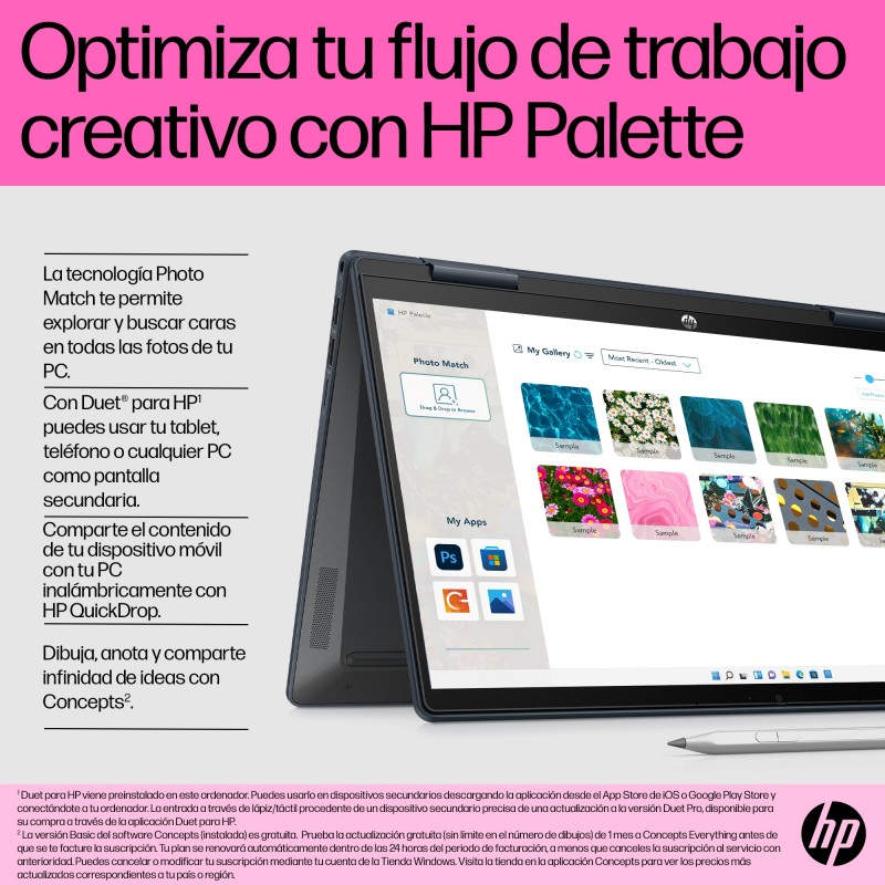 Software preinstalado --> Duet® para HP (30 días de prueba gratuita); ExpressVPN (30 días de prueba gratuita); LastPass Premium (30 días de prueba gratuita), 1 mes de prueba para los nuevos clientes de Microsoft 365, McAfee LiveSafe™; Oferta de prueba gratuita de 1 mes de Adobe