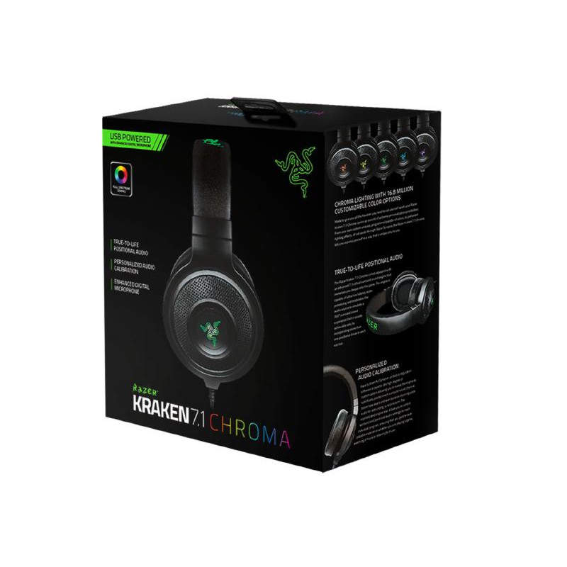 7.1, 20 - 20000, 32?, 112db, Obtén la máxima experiencia de juego con sonido envolvente 7.1 con los auriculares USB para juegos Razer Kraken 7.1 Chroma. Estos auriculares adoptan el diseño del Razer Kraken Pro, y ha sido testeado por numerosos jugadores profesionales para determinar la ergonomía óptima para largas sesiones de juego. Razer Kraken 7.1 Chroma. Utilizar con: PC/Juegos. Tipo de auricular: Binaurale, Estilo de uso: Diadema, Color del producto: Negro. Interfaz del dispositivo: USB, Conectividad del dispositivo: Alámbrico, Longitud de cable: 2m. Audifonos: Circumaural, Frecuencia de auricular: 20 - 20000 Hz, Obstrucción: 32 Ohmio. Frecuencia de micrófono: 100 - 12000 Hz, Sensibilidad de micrófono: -40 Db, Tipo de dirección de micrófono: Uni