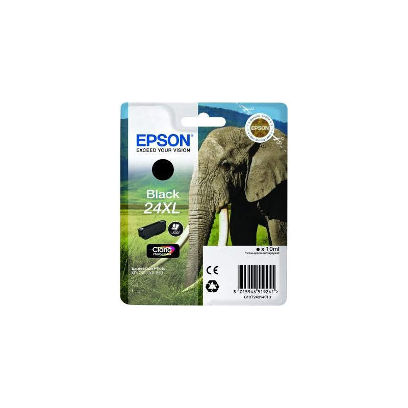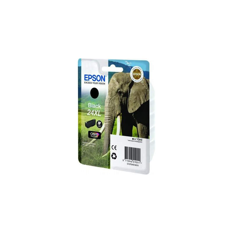 Cartucho Epson 24XL negro Diseñada para imágenes extraordinarias Epson Cartucho Epson 24XL negro. Colores de impresión: Negro, Capacidad: 10 ml, Producción de papel: 500 páginas. Ancho: 14,175 cm, Profundidad: 2,4 cm, Altura: 11,2 cm. Ancho del paquete: 26 cm, Profundidad del paquete: 14,6 cm, Altura del paquete: 12 cm