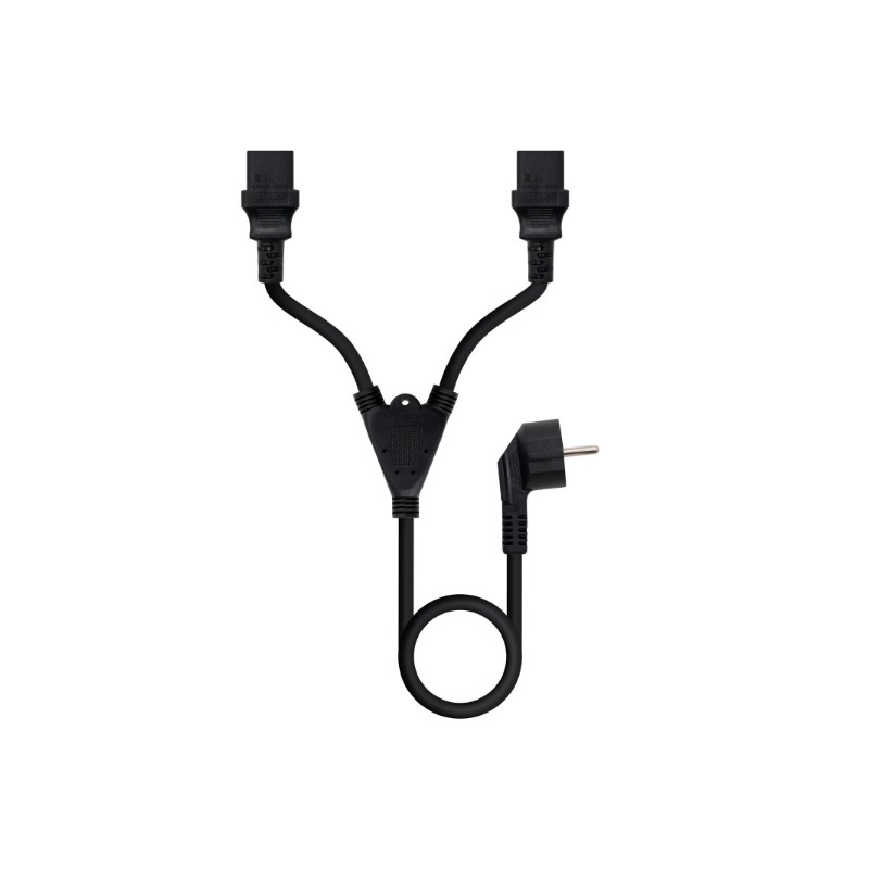 ¡Ahora con nuestro cable de alimentación podrás optimizar los enchufes de tu regleta! Conecta dos ordenadores a una misma toma de corriente y quítate de líos. Perfecto para usar en ámbito doméstico o entornos profesionales. . . Características principales:. . El cable de alimentación cuenta con un conector Schuko macho en un extremo y dos conectores C13 hembra en el otro.. . ¡Nunca ha sido tan fácil! Conecta tus dos pantallas a la red eléctrica utilizando solamente un enchufe.. . Nuestro cable también está pensado para dar energía a una fuente de alimentación con dos entradas C13.. . Especificaciones:. . Se utiliza para conectar dos PCs o dos monitores a una toma de corriente. Conector 1: Schuko (CEE7/7) macho. Conector 2: 2 x C13 hembra. Calibre del cable: H05VV-F 3X0.75m2. Longitud: 1.8 m . Color: Negro. NormativaS: RoHS