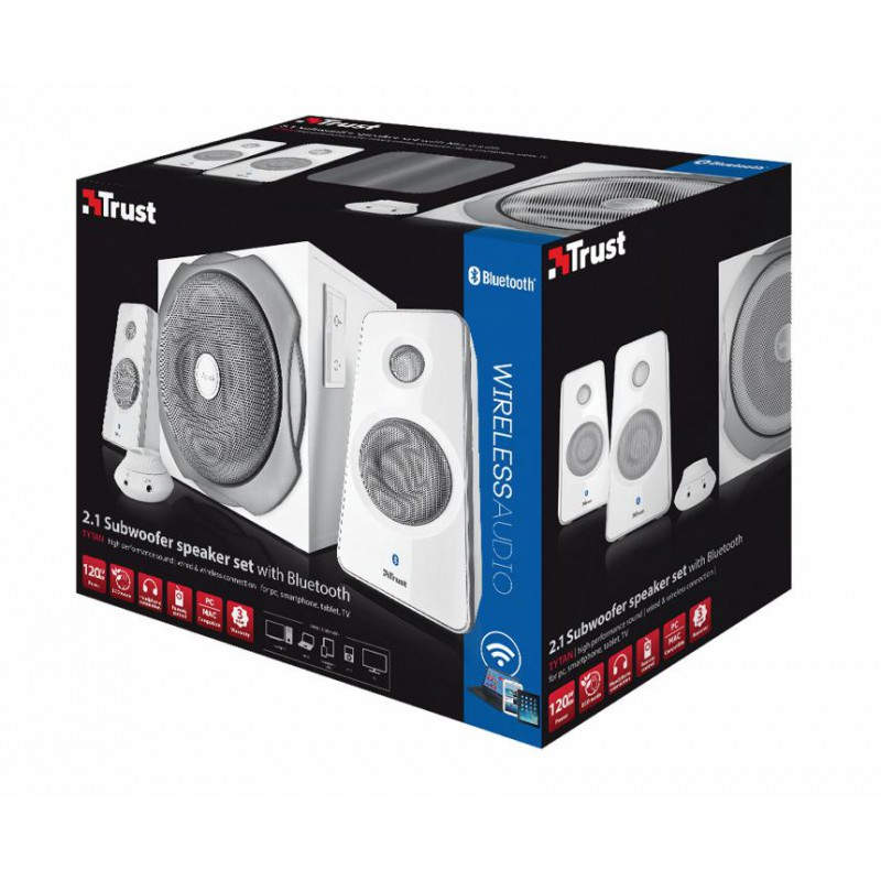 Trust Tytan 2.1. Canales de salida de audio: 2.1, Potencia estimada RMS: 60W, Uso recomendado: Universal. Tecnología de conectividad: Inalámbrico y alámbrico, Versión de Bluetooth: 2.0