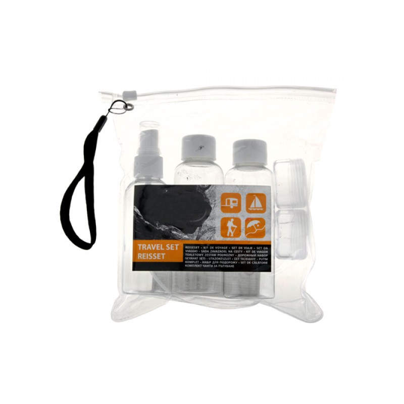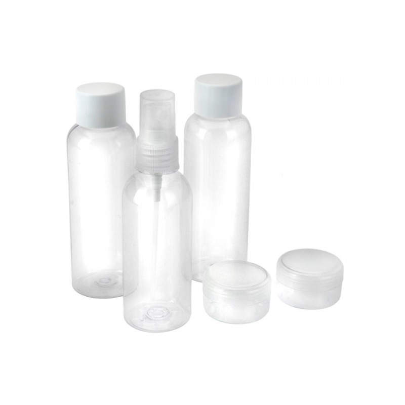 Este set de viaje está fabricado en plástico resistente. Incluye 1 neceser con cierre hermético y asa para transportar (17,5 x 20 cm), 2 botellas con tapón de rosca de 100 ml cada una (aprox.: 12 cm de longitud x 3,5 cm de diámetro), 1 perfumador con vaporizador y tapón a presión de 90 ml (aprox.: 12,5 cm de longitud x 3,5 cm de diámetro) y 2 recipientes de plástico redondos de 20 ml con tapón de rosca (aprox.: 2 cm de longitud x 3,3 cm de diámetro) que podrás usar como pastilleros o con otros fines.