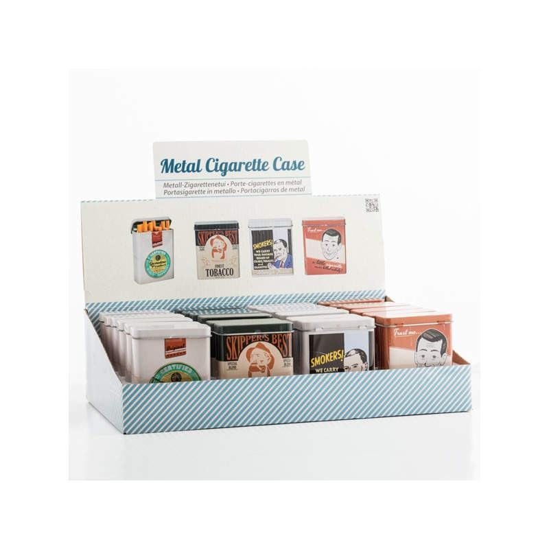 Si eres fumador y te apetece llevar tus cigarrillos con clase y estilo, la pitillera metálica Retro es tu producto. También podrás meter dentro tu paquete de tabaco si te apetece. Ideal también como regalo original. Disponible en varios diseños aleatorios según disponibilidad de stock. Capacidad aprox.: 20 cigarrillos. Expositor punto de venta gratis por la compra de 24 unidades. Medidas aprox.: 7,5 x 9 x 3 cm.