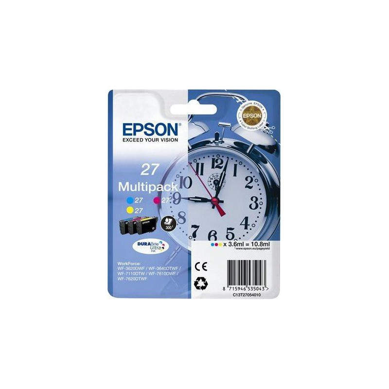 Epson 27 DURABrite Ultra Multi-pack. Colores de impresión: Cian, Magenta, Amarillo, Capacidad: 3,6 ml, Producción de papel: 300 páginas. Tipo de embalaje: Ampolla