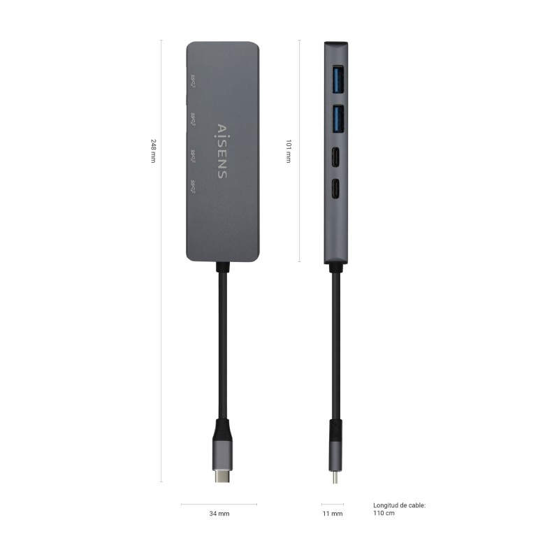 AISENS Hub USB3.2 Gen1 5G USB-C, USB-C/M-2xUSB-C/H-2xUSB-A/H, Gris, 15cm