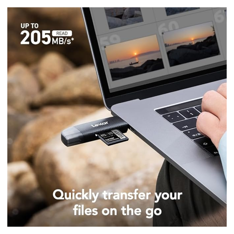 El lector Lexar Dual-Slot USB- A/C transfiere archivos rápidamente entre su PC y dispositivos USB-C con facilidad. Con una ranura para tarjetas SD™ y microSD™ con una velocidad de transferencia de hasta 205 MB/s, este lector puede ahorrarle tiempo a la hora de acceder a sus fotos y vídeos sobre la marcha.