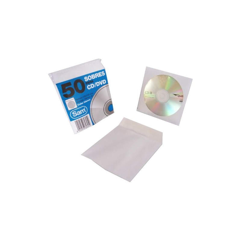 PAQUETE 50 SOBRES PARA CD / DVDS. BLANCO 90 GRS. VENTANA PLASTIC0 108 DIAMETRO 125X125 ENGOMADO AUTOADHESIVO SAM 664897