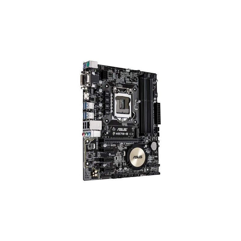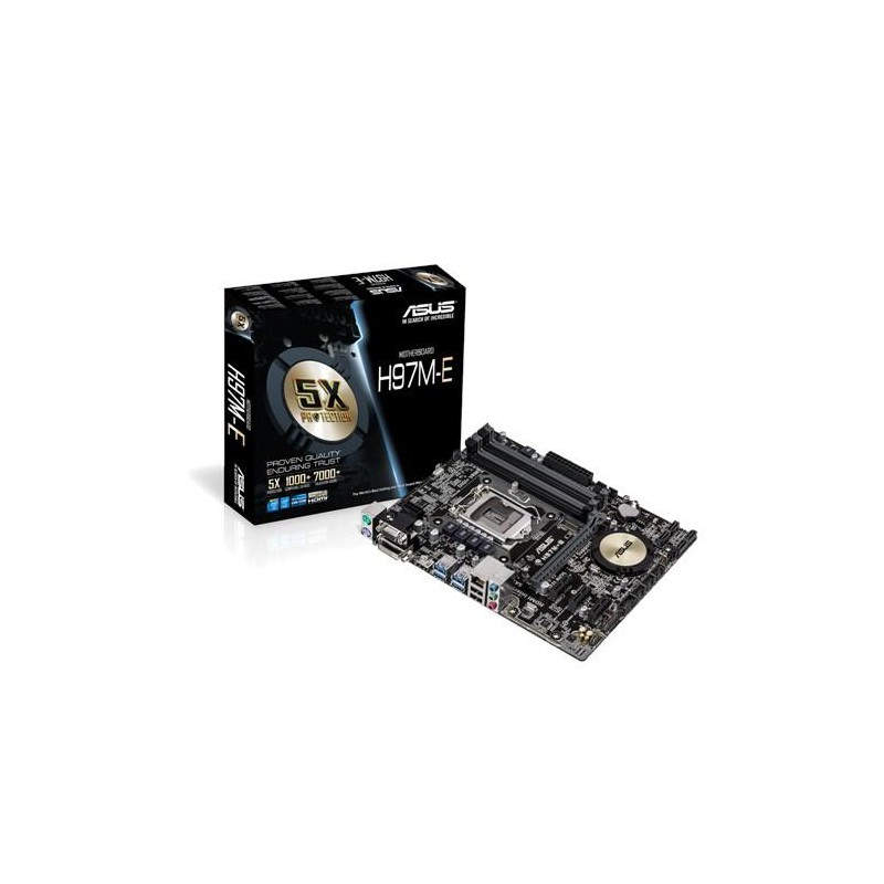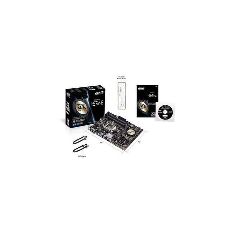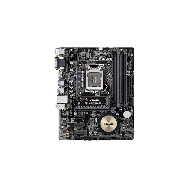 ASUS H97M-E. tipos de memoria compatibles: DDR3-SDRAM, Tipo de ranuras de memoria: DIMM, Soporte de canales de memoria: Dual. Familia de procesador: Intel, Procesador compatible: Celeron, Core i3, Core i5, Core i7, Pentium, Socket de procesador: Socket H3 (LGA 1150). Interfaces de unidad de disco duro soportadas: Serial ATA III. Controlador LAN: Realtek RTL8111GR, Tipo de interfaz ethernet: Gigabit. Componente para: PC, Familia de componentes de tarjeta madre: Intel, Circuito integrado de tarjeta madre: Intel H97