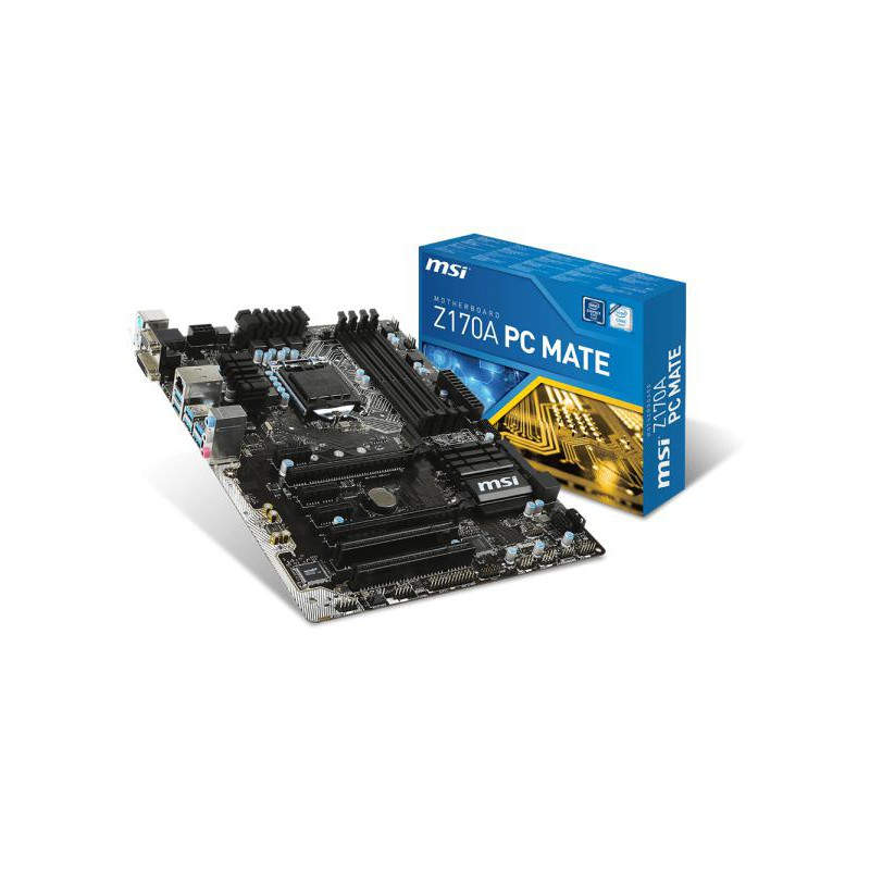 MSI Z170A PC Mate. tipos de memoria compatibles: DDR4-SDRAM, Tipo de ranuras de memoria: DIMM, Canales de memoria: Dual. Familia de procesador: Intel, Procesador compatible: Celeron, Core i3, Core i5, Core i7, Pentium, Socket de procesador: LGA1151. Interfaces de unidad de disco duro soportadas: M.2, SATA. Componente para: PC, Familia de componentes de tarjeta madre: AMD, Circuito integrado de tarjeta madre: Intel Z170. Soporte para proceso paralelo: 2-Way CrossFireX