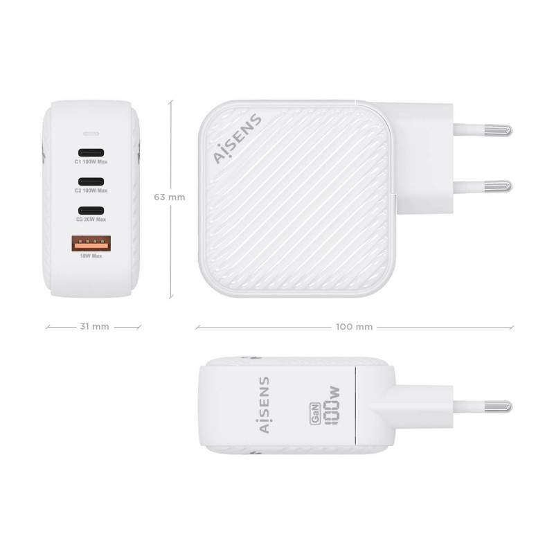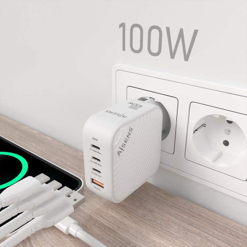 AISENS Cargador GaN 100W, 3xUSB-C PD3.0 QC4.0, 1xUSB-A QC3.0, Blanco