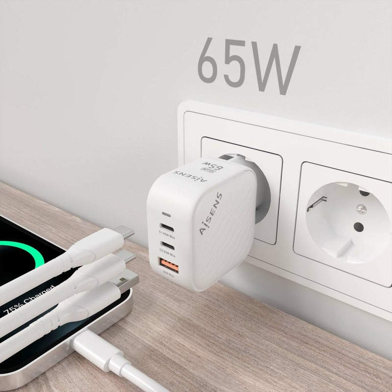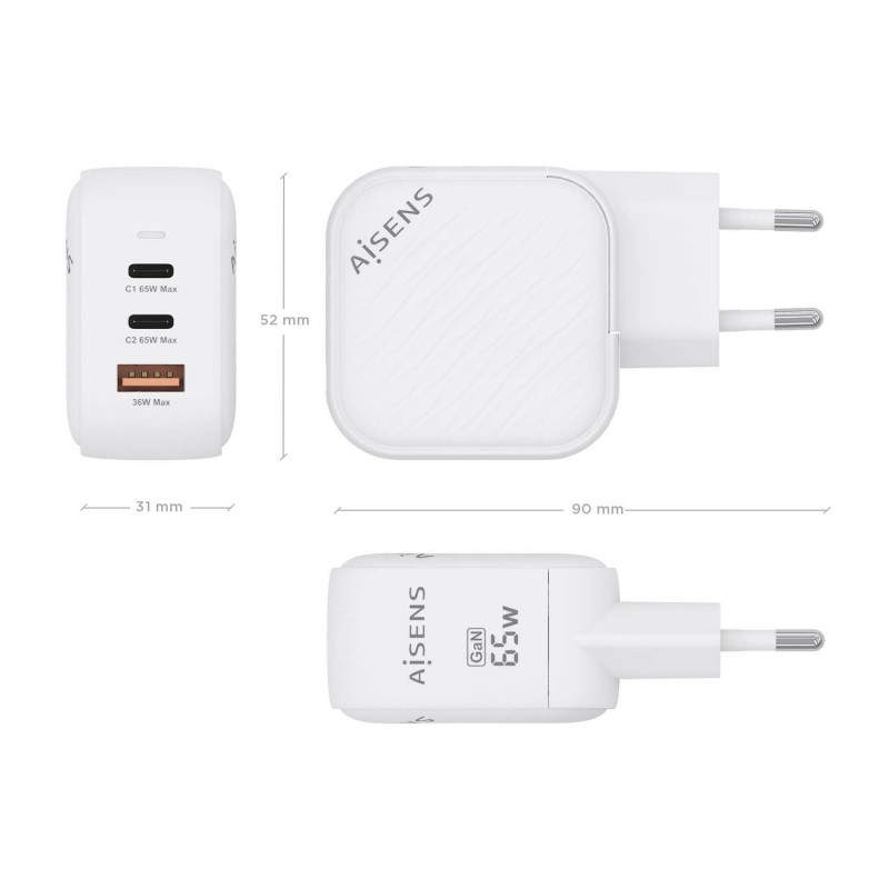 AISENS Cargador GaN 65W, 2xUSB-C PD3.0 QC4.0, 1xUSB-A QC3.0, Blanco
